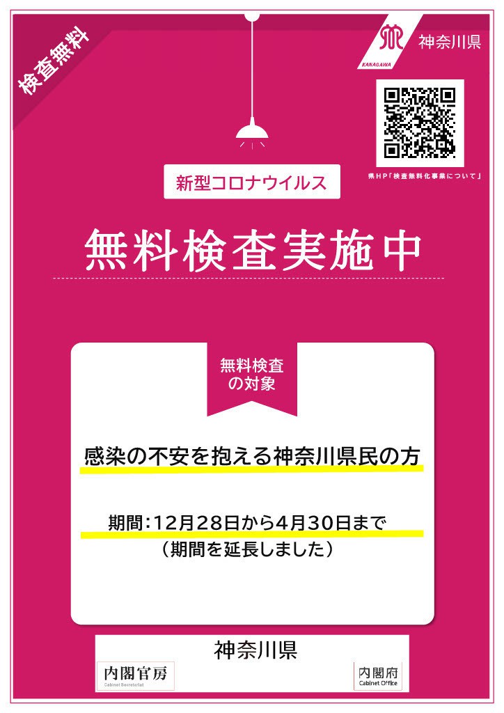 神奈川知事の判断により、感染リスクが高い環境にあるなどの感染不安を感じる無症状の神奈川県民に対して、無料での検査が可能となりました。